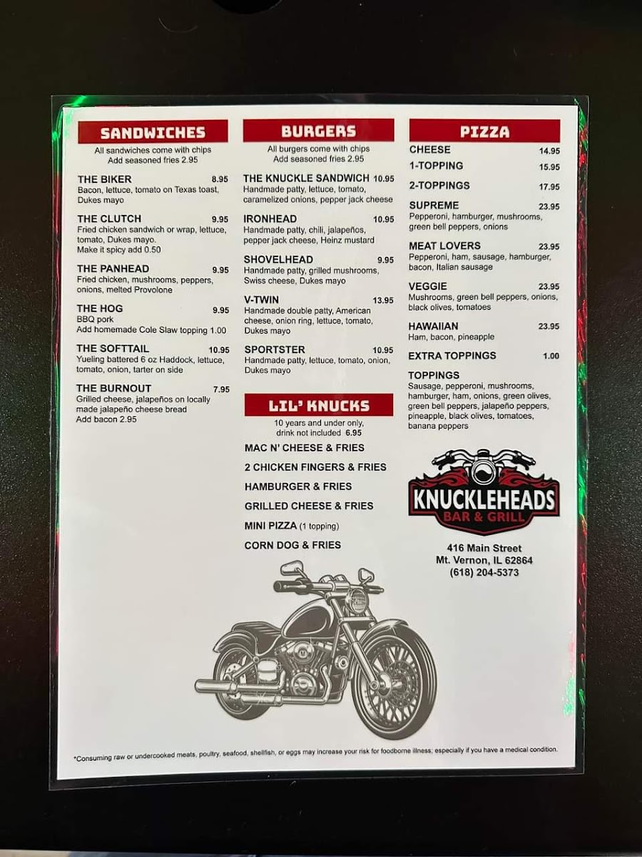 Welcome to Knuckleheads Bar & Grill, an inviting culinary gem located at 416 Main St, Mt Vernon, IL. This establishment takes pride in its inventive menu that caters to diverse palates. Guests rave about the Lowrider Sandwich, a twist on the classic Reuben, where Texas Toast elevates this dish to a new level of flavor.